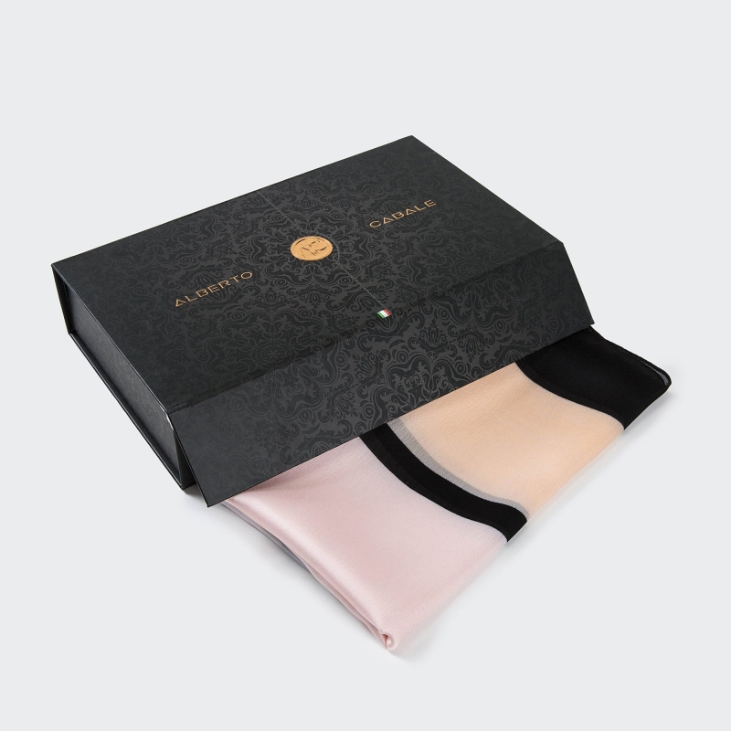 Par l’alliance de la couleur noire au rose très pâle, l’étole 100% soie Pink Florina inspire sobriété et douceur. Avec son design conçu en Italie par la marque Alberto Cabale, ce joli modèle s’adapte à tous vos besoins : accessoire, écharpe, châle, hijab… Inspirez-vous des tendances du moment pour composer un style unique qui vous ressemble ! Trois avantages de la soie Par sa fluidité, le foulard en soie s’adapte à différents usages en épousant parfaitement les courbes du corps. Si certaines l’aiment autour du cou, d’autres l’utilisent pour accessoiriser des coiffures ou protéger le cuir chevelu après une chute de cheveux. On peut facilement détourner l’étole en châle élégant ou en paréo de plage . La soie se porte toute l’année grâce aux propriétés thermiques de sa fibre naturelle . C’est une matière qui régule la température du corps en s’adaptant au climat. Elle tient chaud en hiver et nous aide à rester au frais l’été. Connue pour son extrême douceur, la fibre de soie est très agréable à porter car elle ne provoque aucune irritation . Anallergique, elle apaise les peaux les plus sensibles sans causer de déshydratation. Fiche descriptive de l’écharpe de soie Pink Florina Etole de composition 100 % soie de haute qualité Marque Alberto Cabale Couleurs rose pâle et blanc avec des lignes noires Modèle également disponible en bleu sur notre site AccessModa Coffret cadeau offert pour tout achat d’un article Alberto Cabale sur notre site de foulards en soie pour femme Découvrez notre gamme d’étoles de luxe Chez AccessModa, accédez à des centaines d’ écharpes de qualité en soie, cachemire ou coton biologique. Colorées et pétillantes, elles servent à accessoiriser facilement les tenues de tous les jours et celles des grandes occasions . Noués dans les cheveux ou portés sur les épaules, les foulards Alberto Cabale sont la garantie d’un confort absolu et d’une résistance longue durée. Voyez par vous-même en commandant votre étole favorite sur notre site d’écharpes ! Votre achat est satisfait ou remboursé sous 60 jours. Taille de l’étole soyeuse de marque Alberto Cabale